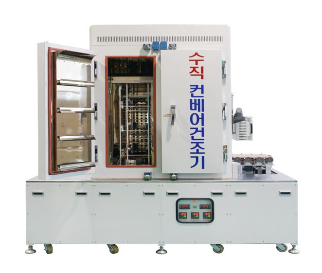 따라 변동) -온도편차:±2˚C ~ ±5˚C -건조 제품크기:고객 사양에 맞춰 설계 변경 -주제어기:PLC -온도제어:PID -속도제어:Inverter -필터사용:고객 사양 -기타:CAM/S-Curve Pusher 구동 방식,챔버 도어 센서 탑재, 과열방지 센서 탑재