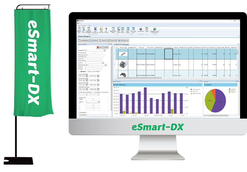제조업에 특화된 당사의 독자적인 생산관리 솔루션 [eSmart-DX] - IoT 활용으로 금형・양산・부품 제조의 관리를 스마트하게 - 실시간 데이터 수집과 분석을 기반으로 한 공정 표준화 작성 - 생산 관리를 효율화하고 품질 향상, 비용 절감, 생산성 향상을 실현 - 수주 등록만으로 자동 스케줄링되어 계획 수립 - 고객의 요구에 맞춰 커스터마이징하여 경쟁력을 강화하고 지속적인 기능 개발