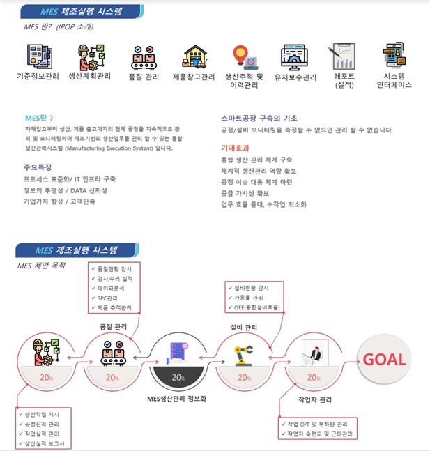 현재 많은 기업들이 ERP 시스템을 도입하였으나 제조를 위한 제반활동을 지원하고, 현장상태의 실시간 정보 제공을 통해 관리자와 작업자의 의사결정을 지원하는 기능이 필요하고 이러한 기능의 필요성에 알맞은 강력한 대안이 MES, 통합생산관리 시스템 이라고 설명드릴 수 있겠습니다.