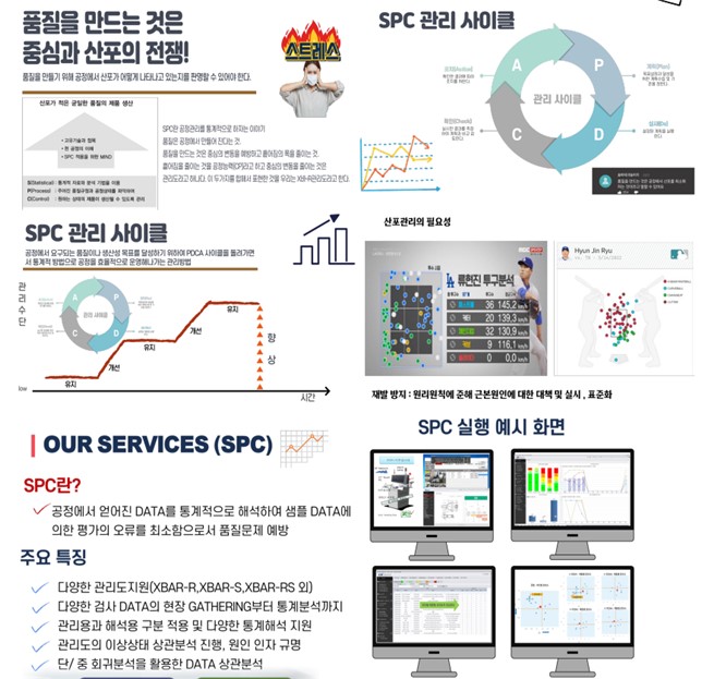 통계적공정관리 시스템으로 검사데이터를 이용한 공정이상 변동의 관리와 공정능력평가를 통한 공정개선요소를 알려주는 제품이라 한 문장으로 설명드릴 수 있을 것 같습니다. 한 예로 두산인프라 코어에서 SPC를 구축하여 협력사와의 업무의 효율을 느끼시고 협력사 수평전개를 진행 했습니다.