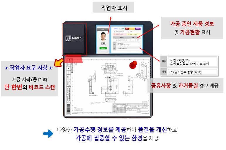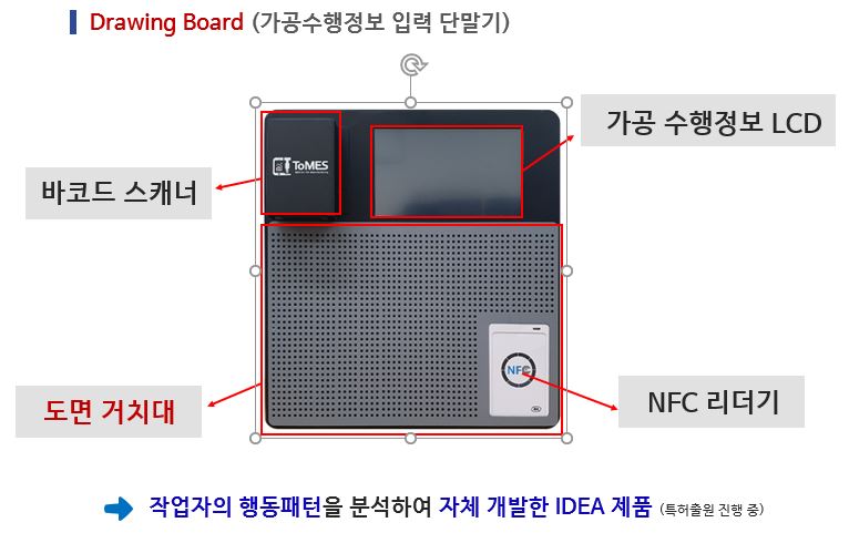 IoT 기반의 생산 현장 실시간 모니터링 체계 구축하며, 제품 제조공정 추적관리가 가능한 시스템입니다. 가공장비와의 I/F를 통해 가공수행정보를 입출할 수 있는 가공수행정보 입출력 단말기(Drawing Board, 특허 등록)를 개발·생산하고 있습니다