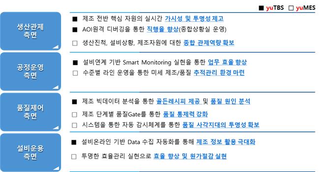 목적 : Global EEDS 기업으로 성장하기 위해 제조 실행 체계를 최적화, 효율화 할 수 있는 스마트공장(yuTBS, yuMES) 구축 방향 : 고객사에 맞는 Smart Factory 모델을 정의하고 내부 효율과 및 외부환경에 선제적, 능동적 대응이 가능한 서비스 구현 배경 - 경영 환경 : 끊임없는 기술 혁신 요구와 글로벌 경쟁력 심화 - 업무 환경 : 일류 제조 회사에 걸맞는 제조 실행 체계와 선진 제조 프로세스를 정착하기 위한 Smart Factory & Smart Work 체계 필요 - 정보기술 환경 : IoT, AI, Big Data, Mobile 등 새로운 ICT 기술 반영