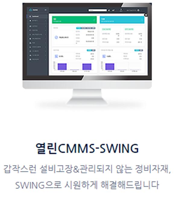 [Swing(CMMS) – 설비관리 시스템] 수리 기록의 부재, 경험 전달의 어려움, 불안정한 정비자재의 수급, 설비고장으로 인한 생산성 저하 등으로 관리의 어려움을 겪고 있는 현장의 목소리를 반영한 Swing은 설비/자재정보, 예방정비/점검, 정비작업, 통계/분석/보고서, 설비 상태 모니터링을 기반으로 기업의 설비관리를 위한 최적의 시스템입니다.