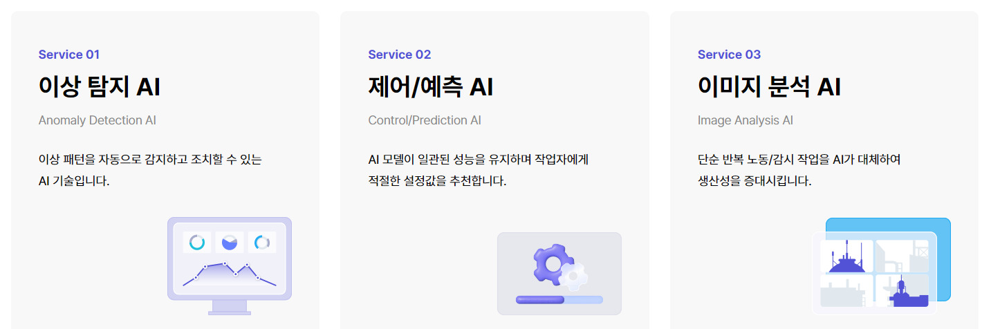 > 이상탐지 AI : 일반적인 데이터 패턴과는 다른, 예기치 않은 신호 등의 비정상적인 징후(이상 패턴)을 자동으로 감지하고 조치합니다. > 제어/예측 AI : 복잡한 현장의 조건 및 상황에 맞추어 제어의 결과를 예측할 수 있습니다. > 이미지 분석 AI : 육안 검사 혹은 단순 반복 노동을 컴퓨터 연산으로 대체하여 작업 속도가 현저히 증가하고 실시간 모니터링에 인력이 투입되지 않아 생산성이 증대됩니다.