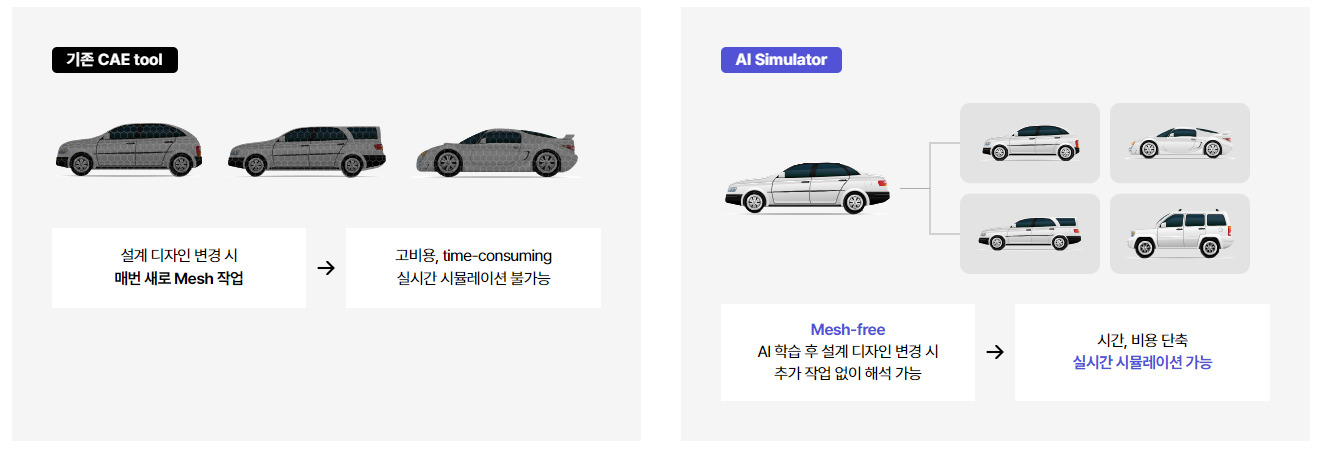 전통적인 mesh-based 시뮬레이션 툴은 제품의 설계가 조금만 바뀌어도 새로 mesh 작업이 필요합니다. 그러므로 실시간으로 시뮬레이션 할 수 없는 것은 물론, 많은 노력과 비용이 소요됩니다. AI Simulator는 한 번 학습한 후에 제품의 디자인을 변경하더라도 다시 mesh 작업이 필요하지 않으며, 재학습도 필요하지 않습니다. 즉, 거의 실시간으로 제품 디자인 변경 후 시뮬레이션 결과를 확인할 수 있습니다. 전통적인 mesh-based 시뮬레이션 툴 대비 100배 이상의 속도 향상이 가능합니다.
