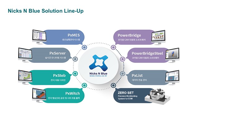 ㈜닉스앤블루는 2010년에 국내 최초로 MCT와 모니터링 상용화에 성공한 PxServer(MCT 실시간 모니터링시스템)를 개발하였고, 국내 특허등록을 하여 지금까지 국내 4,300카피, 530개사 사용자가 사용중에 있습니다. 2019년부터는 스마트공장 공급기업으로 관련 고객사들의 자동화와 생산성 향상의 성과를 내고 있습니다. ㈜닉스앤블루는 2023년도 스마트공장 공급기업 역량진단 지원사업을 통해서 우수 공급기업으로 선정되었습니다. ㈜닉스앤블루는 금형 가공관련 CAD/CAM 통합 솔루션 개발에서 MCT 가공 관련 솔루션까지 다양한 제품을 개발/공급하고 있으며 금형 제조 업체에서 쉽고 부담없이 연구 개발을 퉁해 경쟁력을 향상할 수 있도록 다양한 국가 지원 사업을 안내하여 고객의 성장을 돕는 회사입니다.
