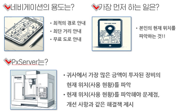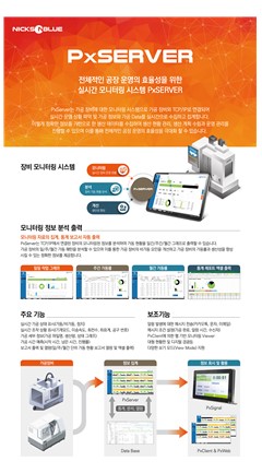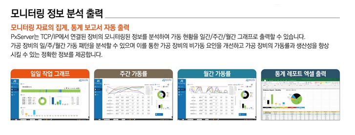 PxServer PxServer는 가공 장비에 대한 모니터링 시스템으로 가공 장비와 TCP/IP로 연결되어 실시간 운영 상황 파악 및 가공 정보와 가공 Data를 실시간으로 수집하고 집계합니다. 이렇게 정확한 정보를 기반으로 한 생산 데이터를 수집하여 생산 현황 관리, 생산 계획 수립과 운영 관리를 진행할 수 있으며 이를 통해 전체적인 공장 운영의 효율성을 극대화 할 수 있습니다.