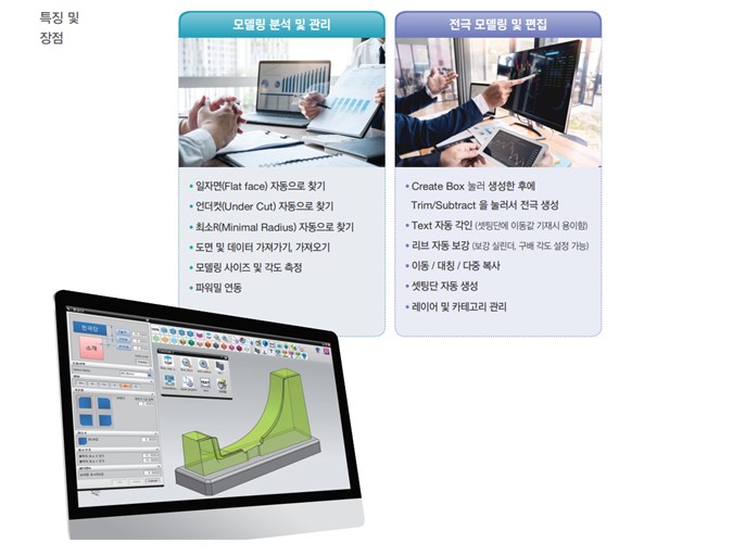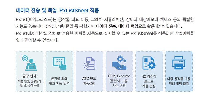 3.PxList(피엑스리스트) 데이터 전송 관리 시스템 PxList(피엑스리스트)는 각 기계별 포스트와 데이터의 형식을 자동으로 변환해주며, 공정, 공구 길이, 공구 번호, 공구 직경 등을 자동으로 편집, 관리하는 데이터 전송 관리 프로그램입니다. 4.PxSteb Pro(피엑스스텝프로) 전극 모델링 자동화 시스템 PxSteb(피엑스스텝)은 3D CAD 프로그램(UG)에서 다이렉트 인터페이스가 지원되는 전극자동 디자인 프로그램 입니다. 전극 추출, 모델링 편집 및 관리를 위한 기능을 가지고 있어 전극 디자인을 간편하고 빠르게 처리할 수 있습니다.