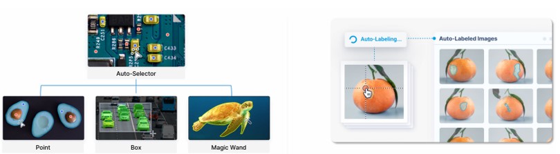2. AI 기반 레이블링 AI 기반의 레이블링 기능들이 레이블링 정확성과 일관성을 유지하며, 동시에 리소스를 최소화합니다. 객체를 기반으로 유사한 특성을 지니는 영역을 딥러닝 알고리즘이 자동으로 레이블링하여 개별 이미지들에 대한 사용자의 수동 레이블링 작업이 불필요합니다. 또한, 사용자가 레이블링한 소수의 이미지가 전체 데이터의 레이블링 기준이 되어 레이블링 공수를 최소화하면서도 높은 정확도를 보장합니다.