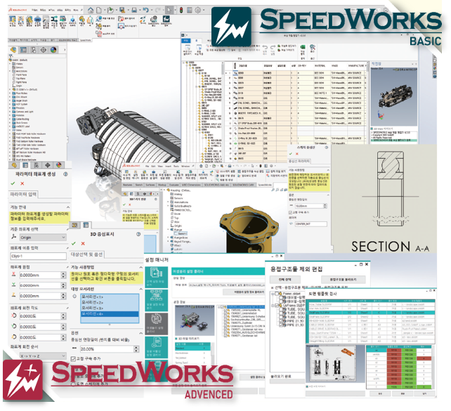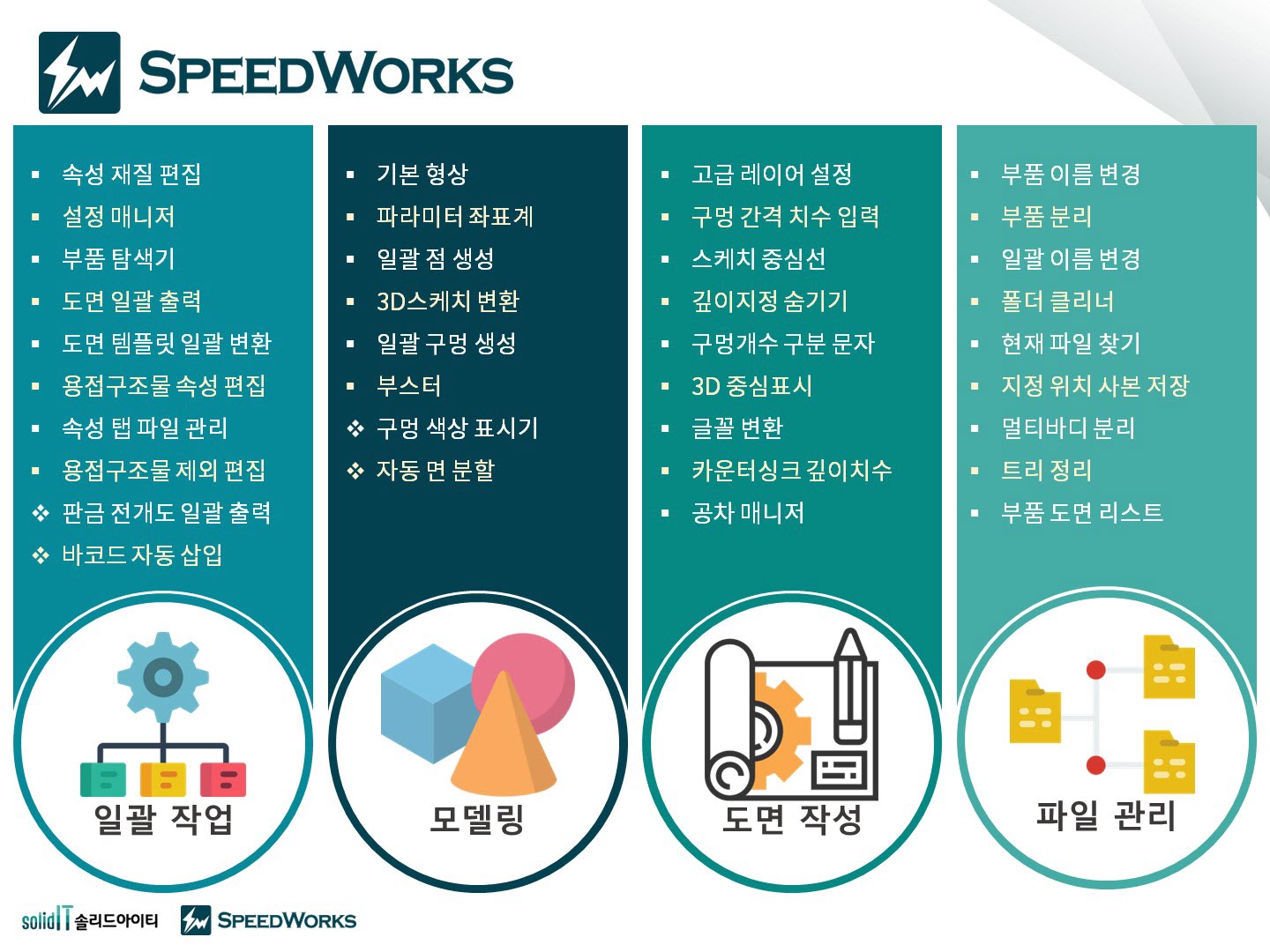 대표 출품 제품 소개 SpeedWorks는 ‘어떻게 하면 더 편하게, 그리고 더 빠르게 설계할 수 있을까’ 라는 물음에서 시작된 프로그램입니다. 이 제품은 30여개의 기능이 일괄작업, 모델링, 도면 작성, 파일관리 4가지의 카테고리로 구성되어 있습니다.